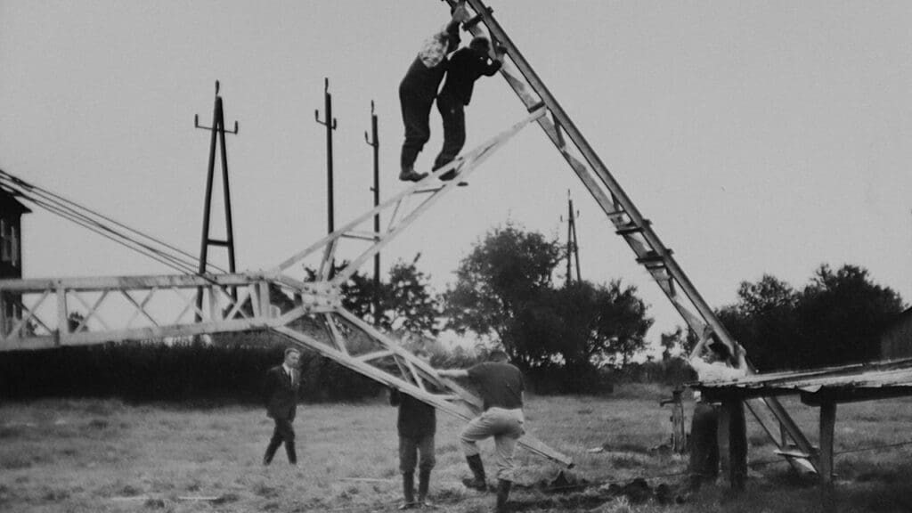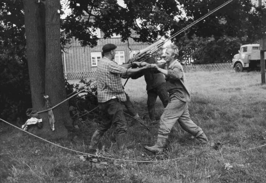 Das Verlegen von Freileitungen war Knochenarbeit: Nur mit Hilfe eines Seilzugs,einem mechanischem Gerät mit Ratschenmechanismus, wurden die Masten aufgerichtet. Lange Holzmaste wurden von Hand getragen, schwere Kabel durch schneebedeckte Felder gezogen.